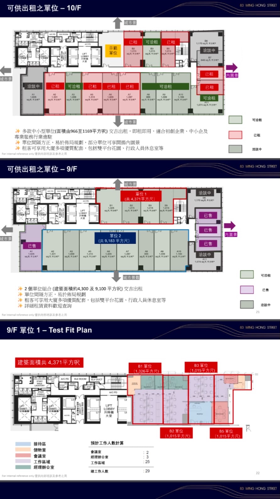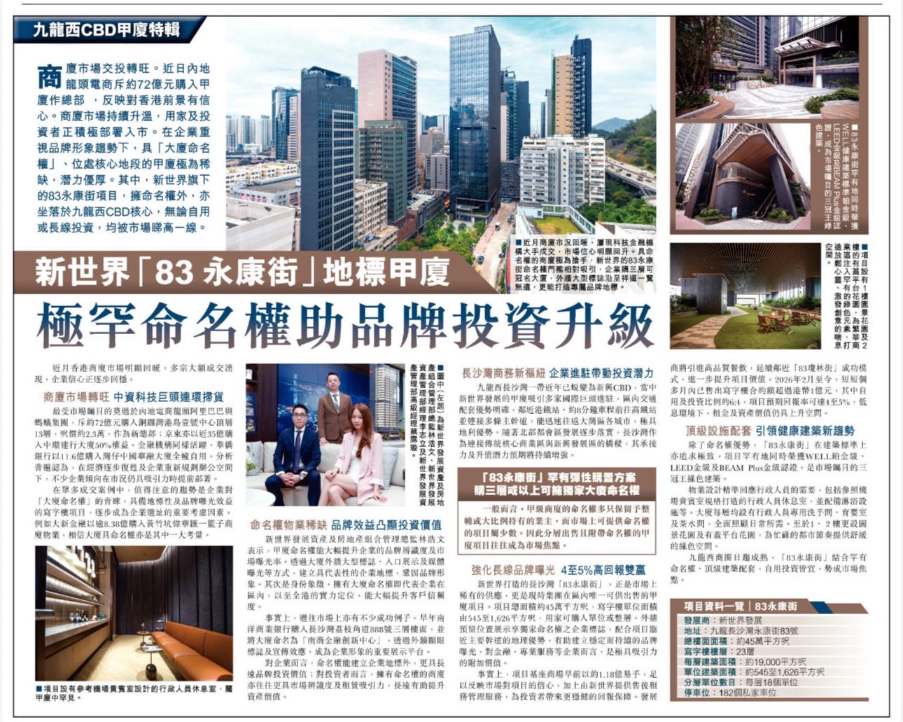 目前,市場上連命名權出售的甲級商廈選擇不多,位於九龍西,由新世界發展興建的83永康街正是相關罕見物業之一。項目已屆現樓,可即買即用。項目總建築面積約45萬平方呎,共23層寫字樓,每層建築面積約19,000平方呎,分間成18個單位,面積由545至1,626平方呎不等。靈活的間隔設計讓企業可根據需求購買合適單位,更可選擇全層使用。購入3層或以上樓面的企業更可獲得命名權,配合矚目的招牌位置,充分發揮品牌宣傳效益。